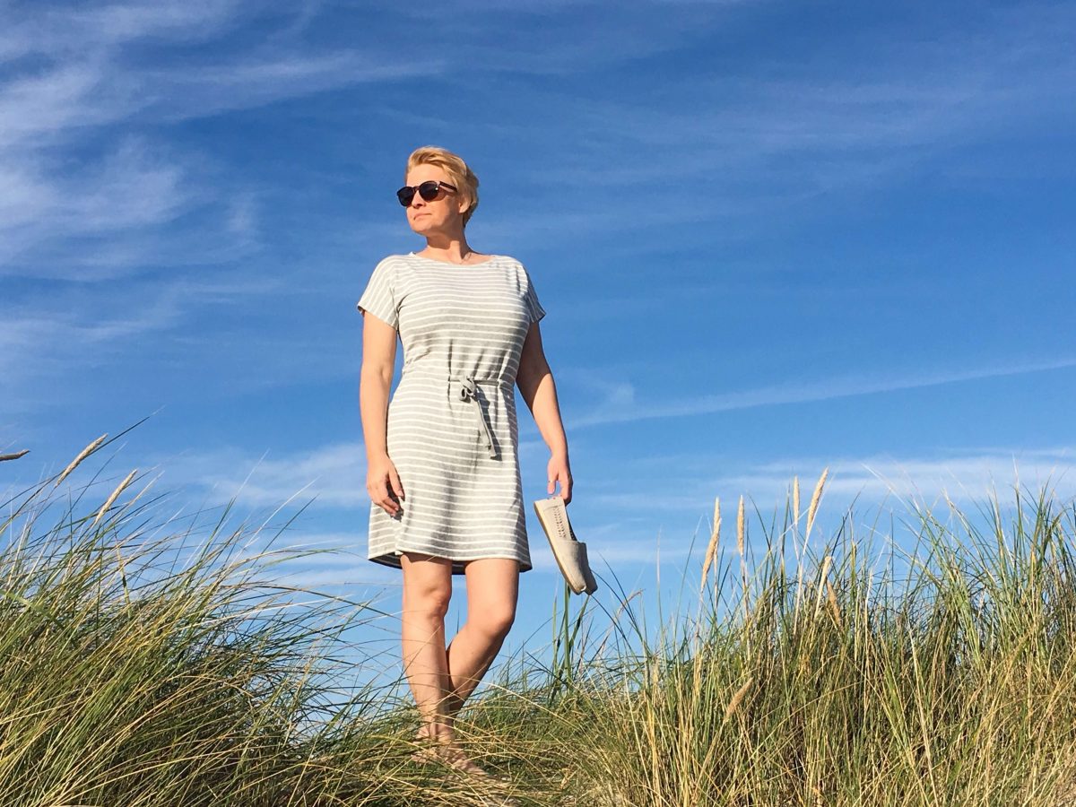 Der leichte und dünne grau-weiße Sommersweat fällt ganz toll und ist sehr angenehm zu tragen! So ein Kleid werde ich mir bestimmt noch mal nähen, dann vielleicht auch mit Taschen und einem kleinen Umschlag an den Ärmeln!